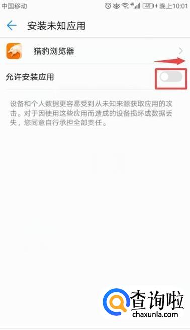 弹出的界面,我们将该软件中的允许安装应用的开关向右滑动打开就可以了。这样就可以安装软件了。