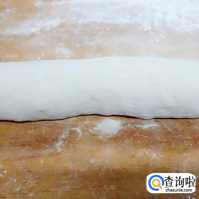 当面团发酵至原面团一倍大左右时,面团就发酵好了,放在面案上,加入适量干面粉揉成长条。