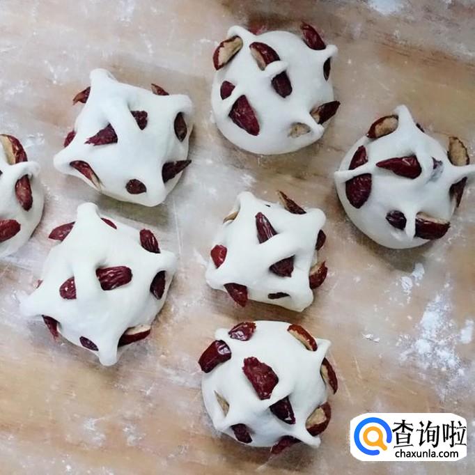 揪成适量大小的剂子,揉成馒头形状,在馒头胚的顶部放入一条红枣,四周均匀放入四条红枣,红枣馒头胚就做好了。