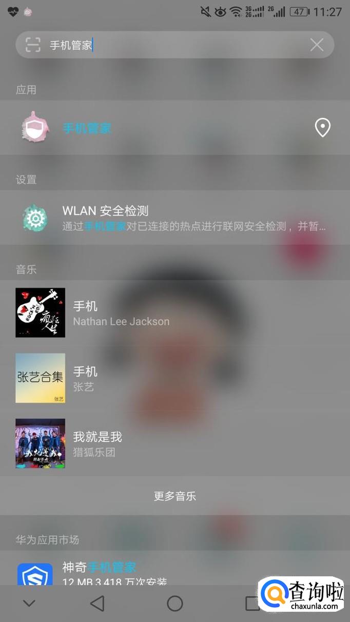 打开华为手机,下拉界面,进入搜索栏,点击搜索华为自带的“手机管家”软件。