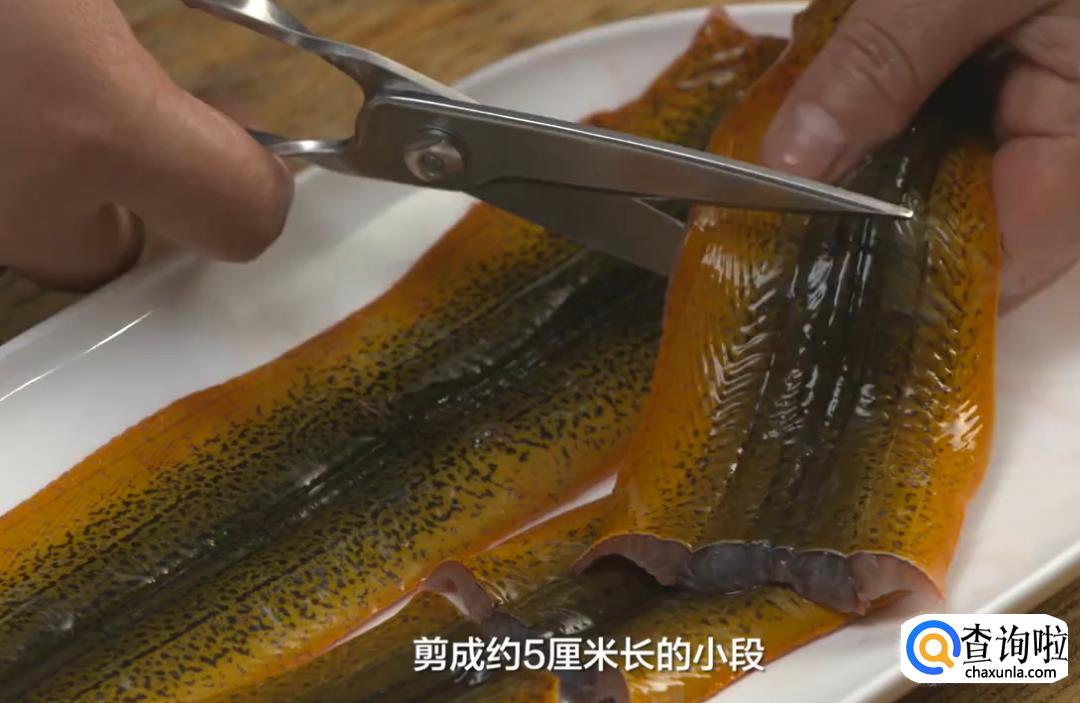将去除内脏的鳝鱼,洗净后沥干;剪成约5厘米长的小段。