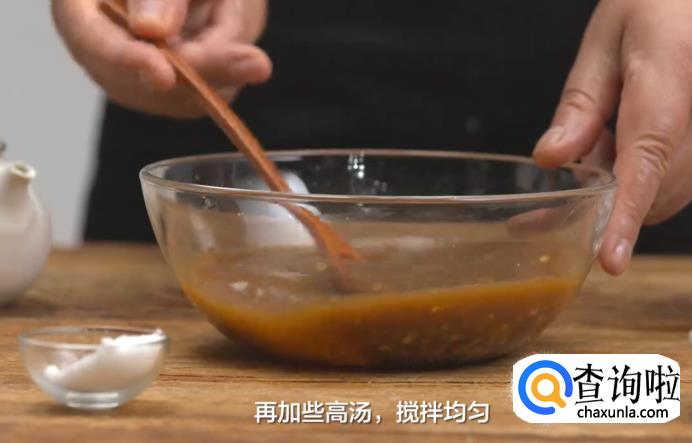 调制酱汁:混合生抽、糖、醋、姜末、蒜泥、生粉,再加些高汤,搅拌均匀。
