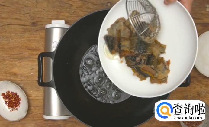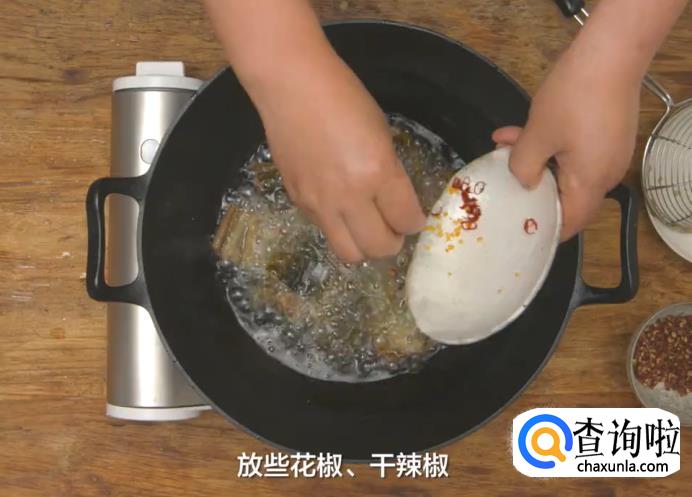 待鳝鱼稍微冷却后,再回锅炸一次,放些花椒、干辣椒,炸至黄亮,捞出沥油,盛盘。