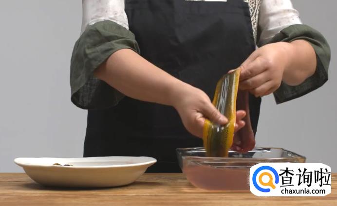 接着热锅起猪油,油化后,烧得烫一些,放入蒸好的鳝鱼,炸至表面微黄后捞出,