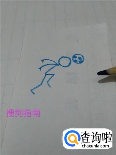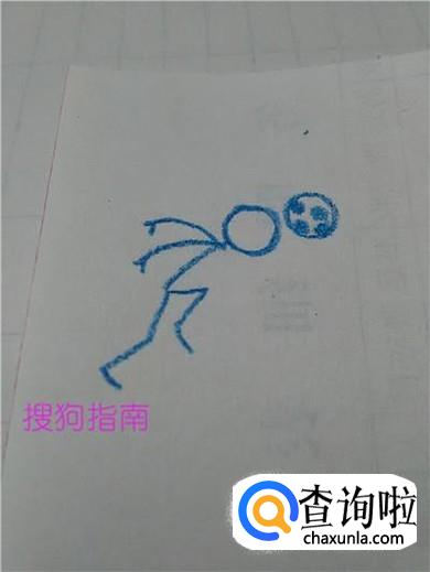 在火柴人头部右侧再画一个圆形,表示足球,在足球里面画几个圆点,表示足球上的图案,这幅图说的是一个火柴人正在奋力顶球。