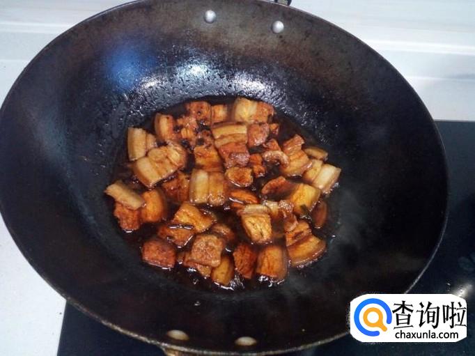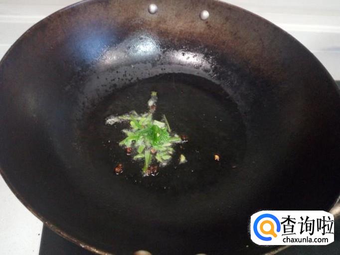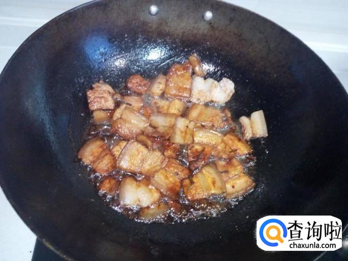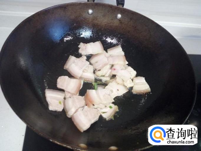 锅内重新放入油加热,油热后放入花椒,葱,姜,爆锅,放入煮好的五花肉翻炒。