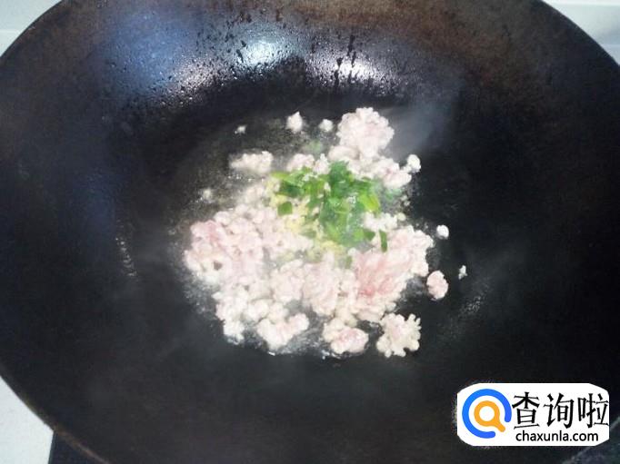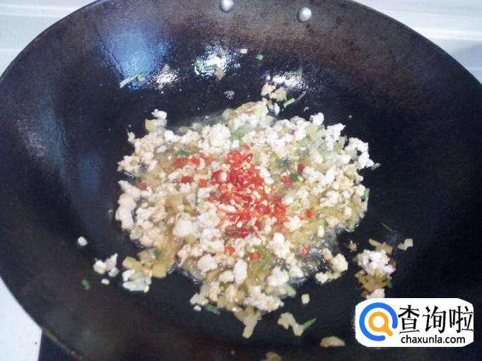 锅内放入油加热,油热后放入肉末翻炒,然后放入葱姜,榨菜,辣椒末。