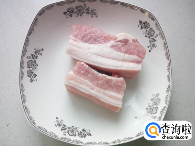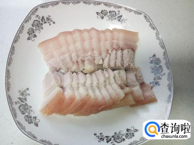 五花肉用水清洗干净,放入锅中煮十多分钟,然后捞出,切成片,备用。