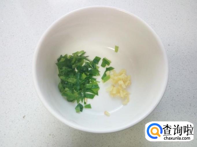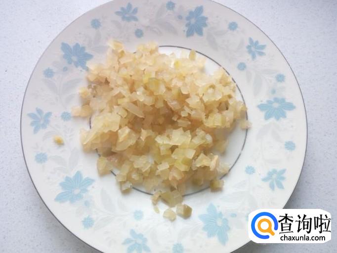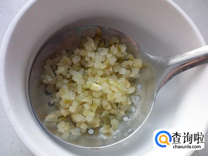 榨菜切成碎末,用清水投几遍,沥干水分,备用。