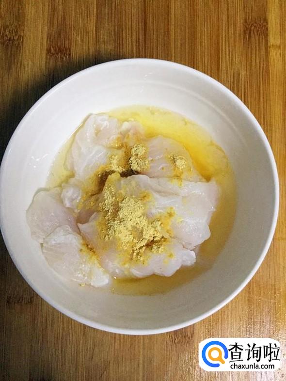 龙里鱼柳室温解冻后切成薄片,放入碗中,依次加入1小勺料酒、生姜粉和盐,拌匀后静置10分钟。