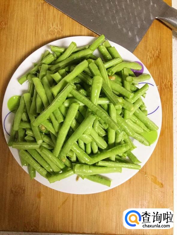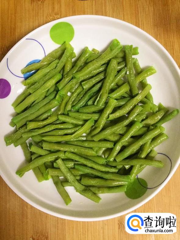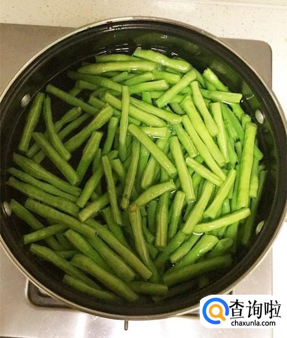 锅中放入适量水,大火煮开后,把处理干净的豇豆放入锅中,汆熟。