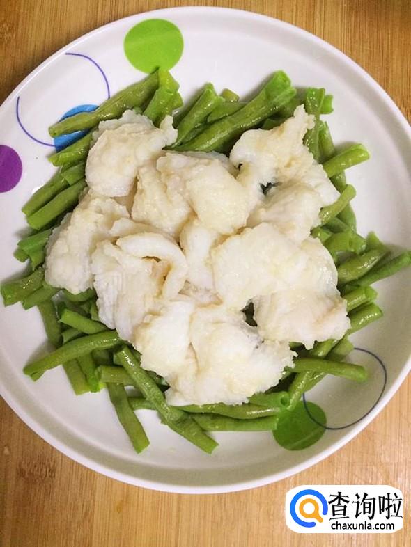 汆熟后的龙利鱼片很嫩,小心地捞出,放在豇豆上。