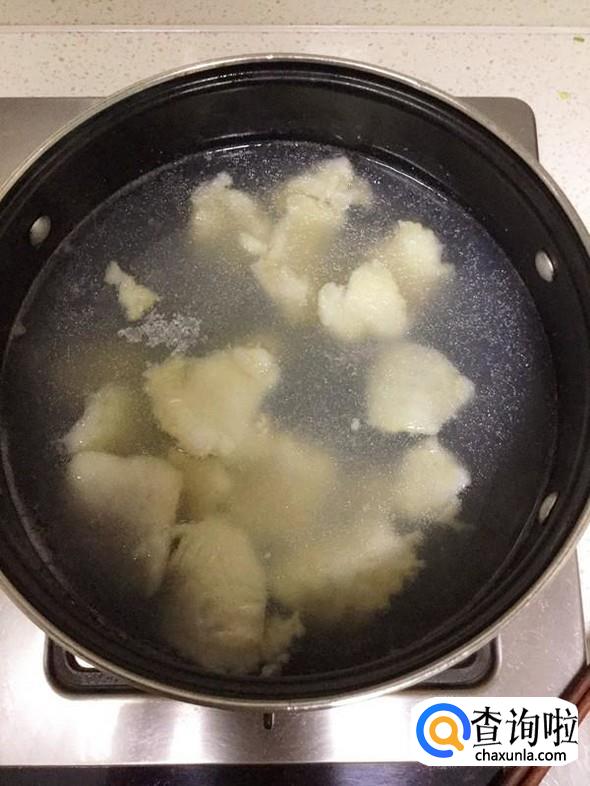 锅中加入适量水,再放入一些姜片,大火煮开,然后把龙利鱼片捞出放入锅中,汆熟。
