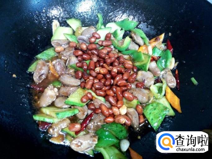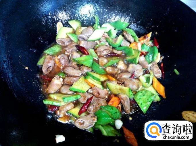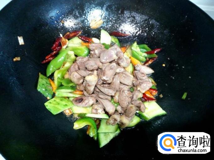 黄瓜片,青尖椒片略翻炒一下,随即放入炒好的鸡心翻炒。炒至鸡心沾满料汁后,倒入勾兑好的芡汁。