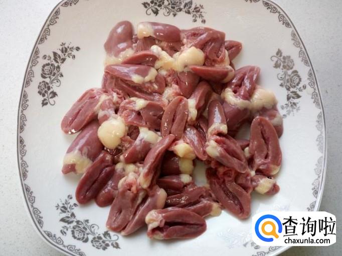 鸡心用水清洗干净,控干水分,切成对半。去除上面的血管,血块,放入少许盐,料酒,五香粉,腌制20分钟。