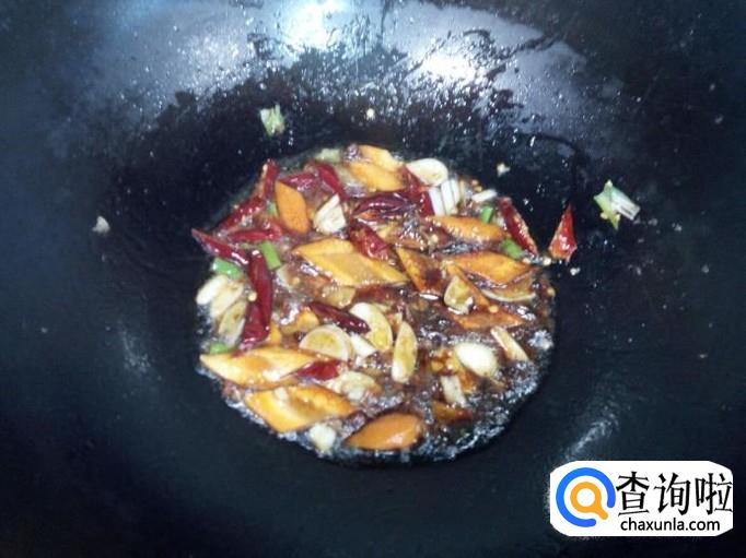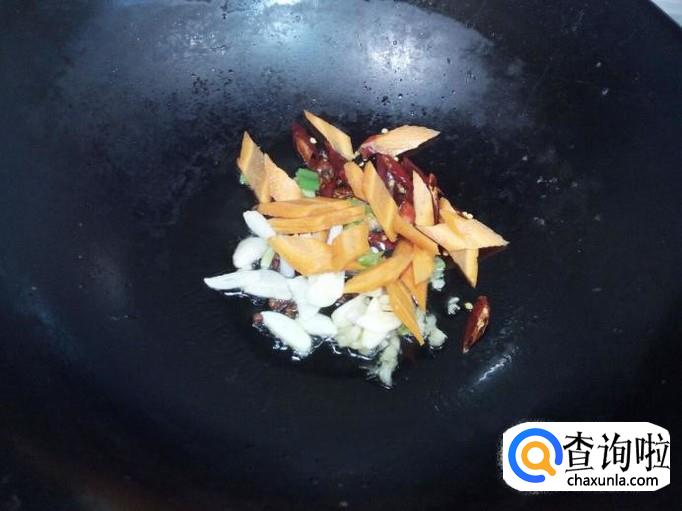 锅内重新放入油加热,油热后放入花椒,红干椒,葱,姜,蒜,爆香。放入红萝卜片翻炒至变软。