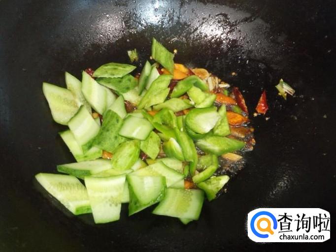 放入料酒,少许白糖,少许醋,少许耗油,酱油,盐,翻炒成汁。然后放入黄瓜片,青尖椒片翻炒。
