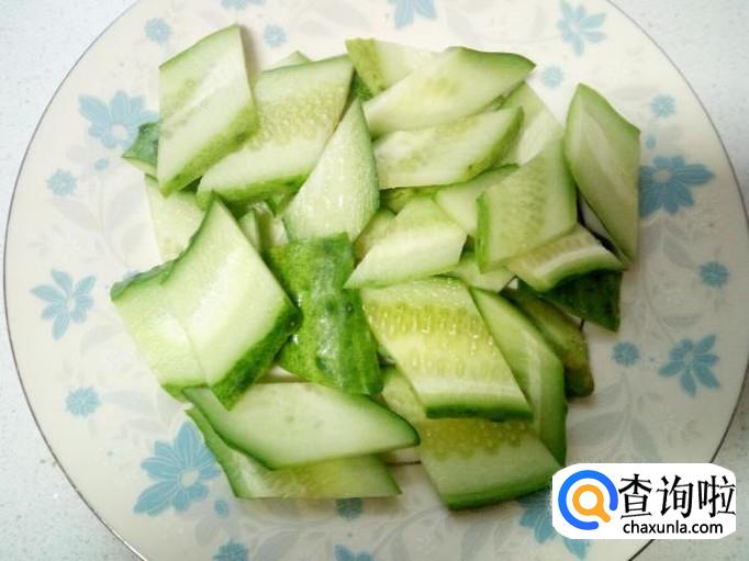 黄瓜用水清洗干净,控干水分,切成片。青尖椒用水清洗干净,控干水分,切成片。