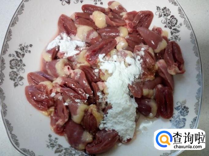 把腌制好的鸡心,放入适量的淀粉,用手抓匀。