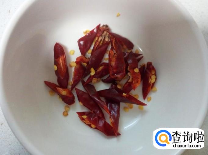 红干椒用水清洗干净,控干水分,斜刀切成段。切好葱,姜,蒜,备用。