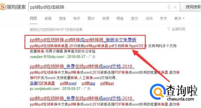 进入之后,搜索“ppt转pdf在线转换”,进入搜索结果页面点击并进入,如图所示。