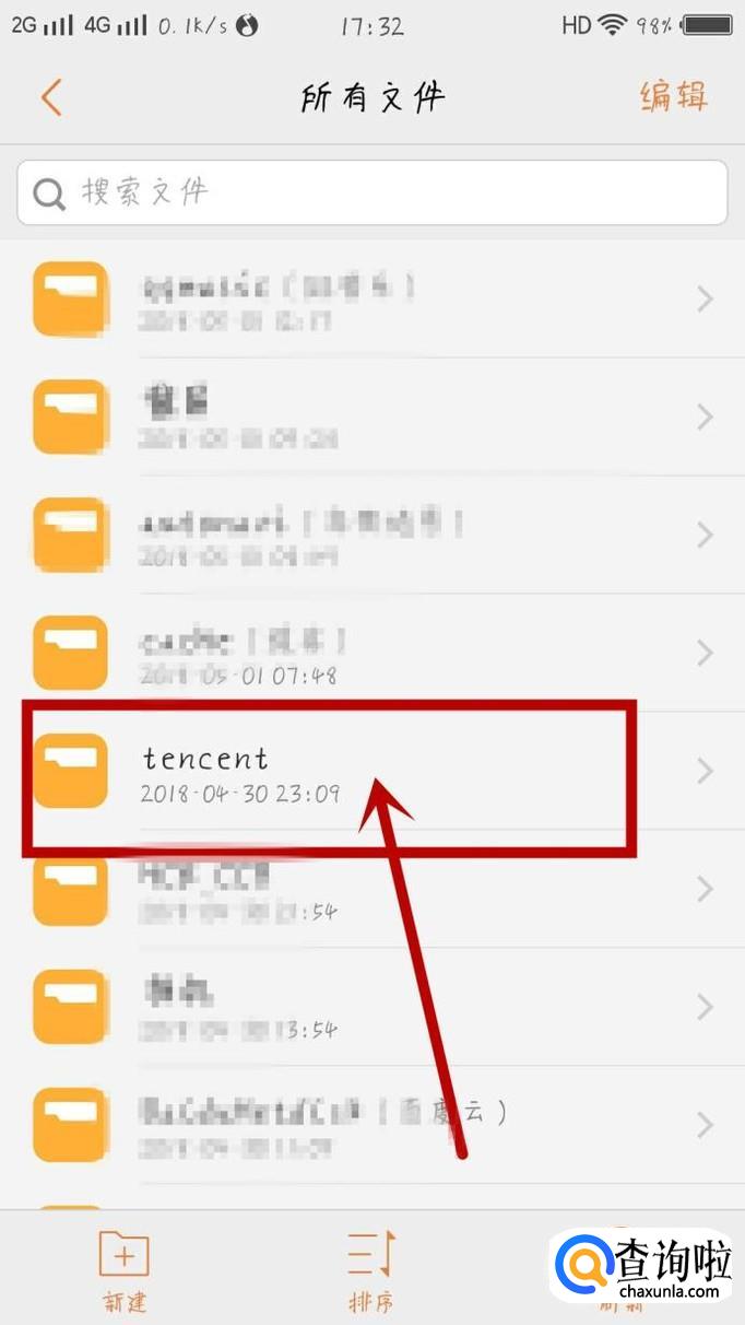 在“所有文件”页面,找到“tencent”文件夹,点击并进入,如图所示。