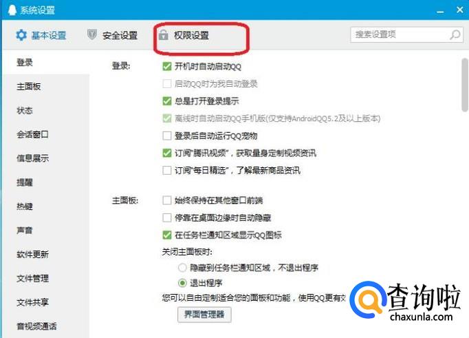 弹出“系统设置”选项框,我们直接点击“权限设置”标签。