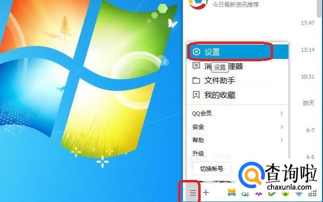 在QQ界面的左下角,点击图中所示的图标,弹出菜单后选择“设置”。
