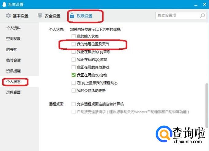 在权限设置下,我们点击左边栏的“个人状态”,然后把“我的地理位置及天气”前面的对勾去掉,这样就不会显示所在地点了。