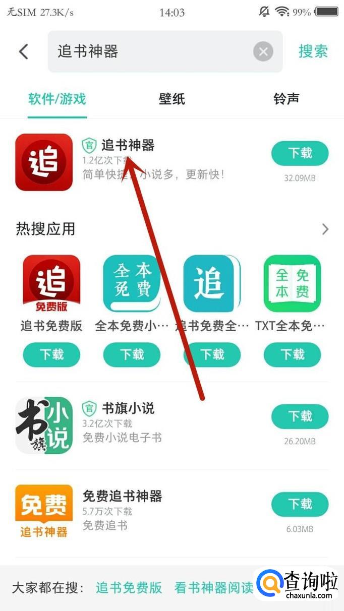 在搜索结果页面点击“追书神器”,如图所示。