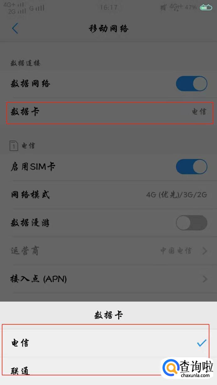 如果还是没有解决,就切换其它的SIM卡试试,点击【数据卡】选择切换其它的SIM卡试试,如果换了其它的SIM卡可以使用,卡首先是没有问题的。