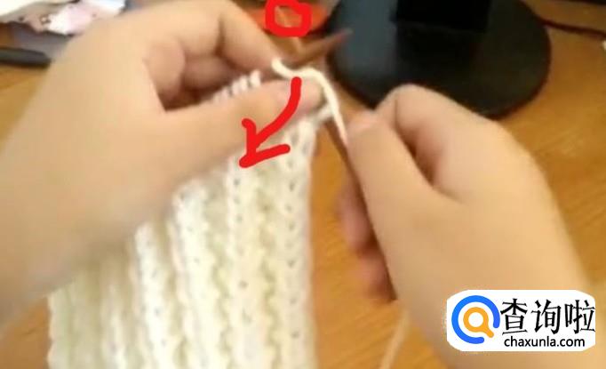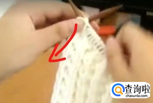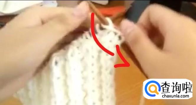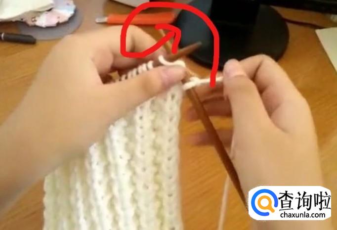 最后一针,将右手的围巾针从前往后插入左手围巾针的最后一个线圈,然后给右手围巾针绕线一圈,然后右手围巾针抵着线从左手围巾针下穿到上面,再取下左手围巾针即可。下一排织法重复以上步骤。