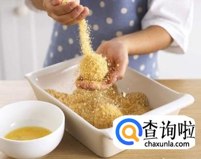 取一个生鸡蛋,打入碗中,搅散,将熟鸡蛋在生鸡蛋蘸一下,再放到面包屑中滚几圈,让鸡蛋裹上面包屑。