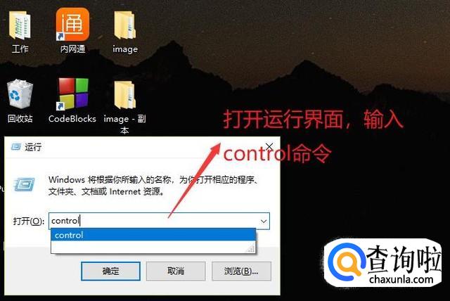 然后按Win+R组合键打开运行界面,输入control命令,如下图所示