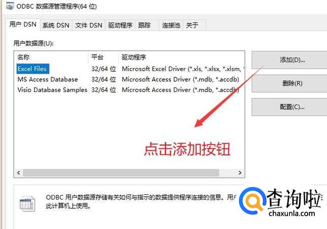 在弹出的ODBC数据源管理程序界面中点击右侧的添加按钮,如下图所示