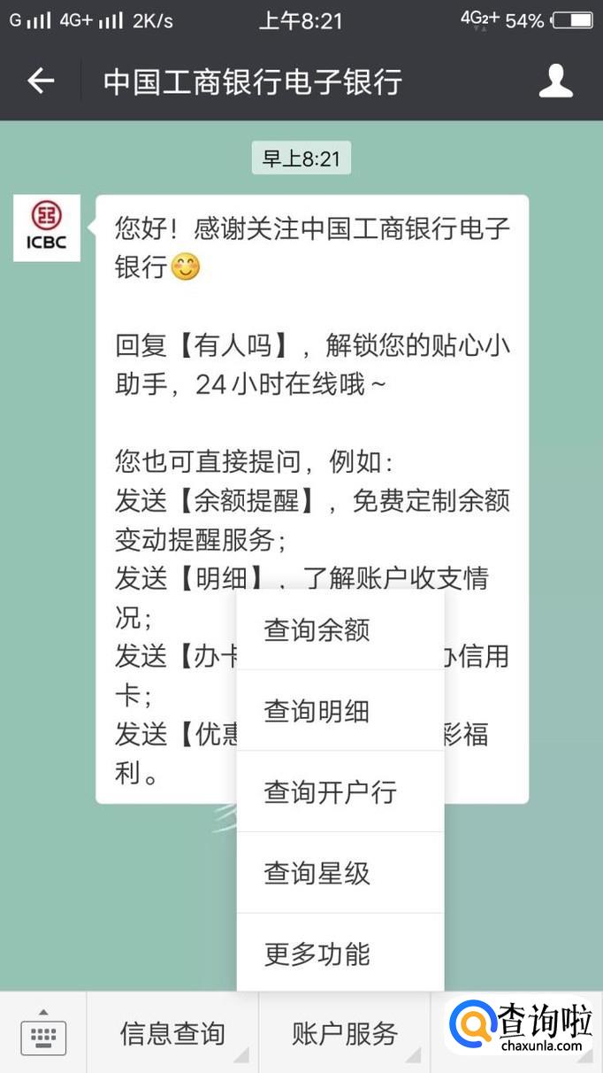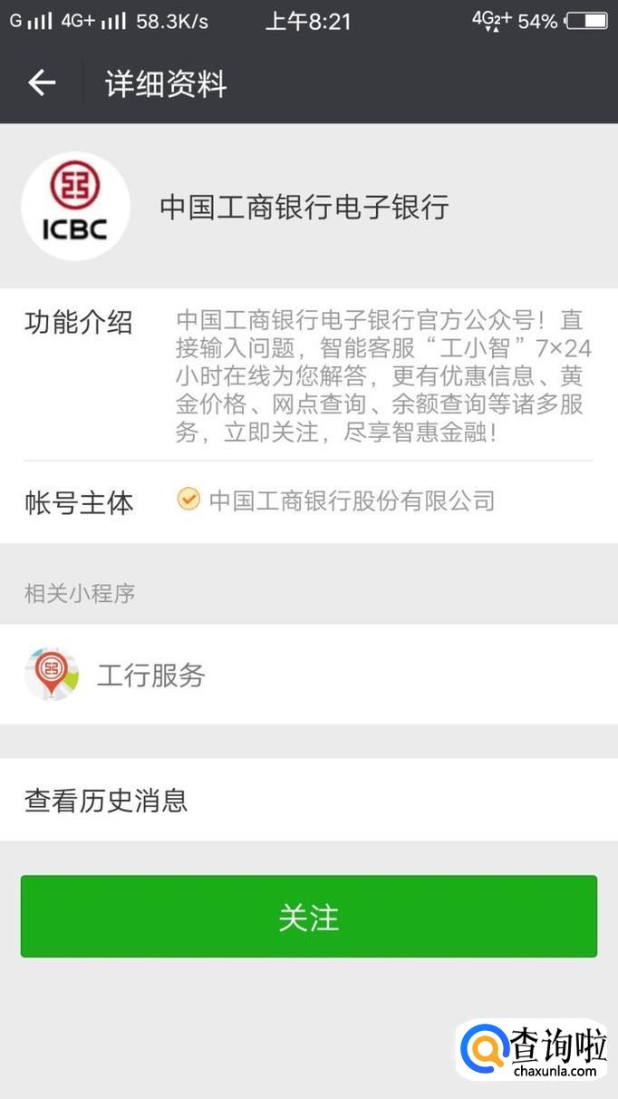搜索到“工商银行电子银行”后点击关注即可。随后进入公众号界面,接下来进行银行卡余额查询。