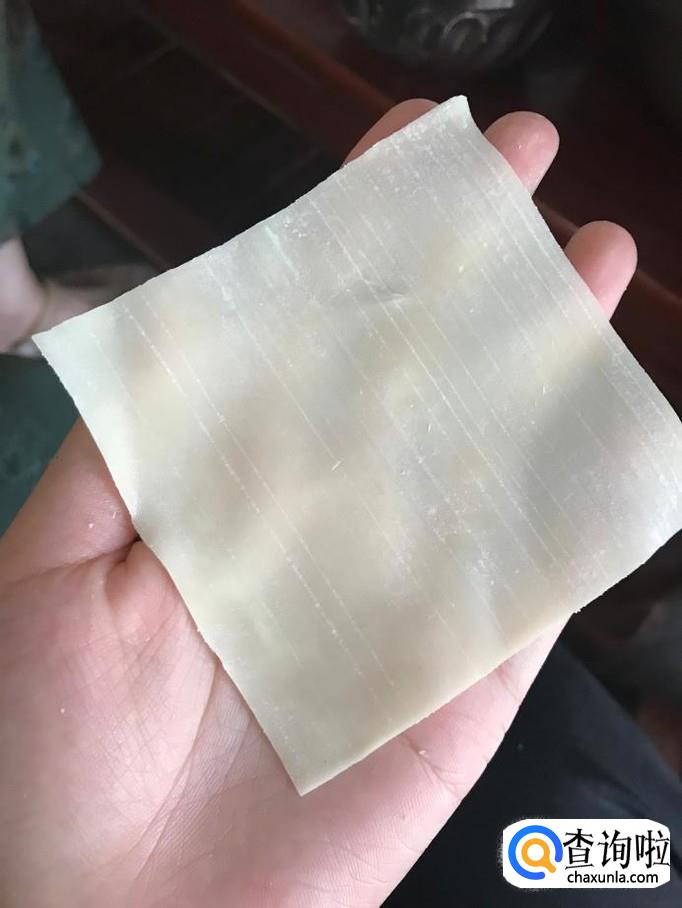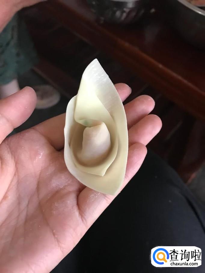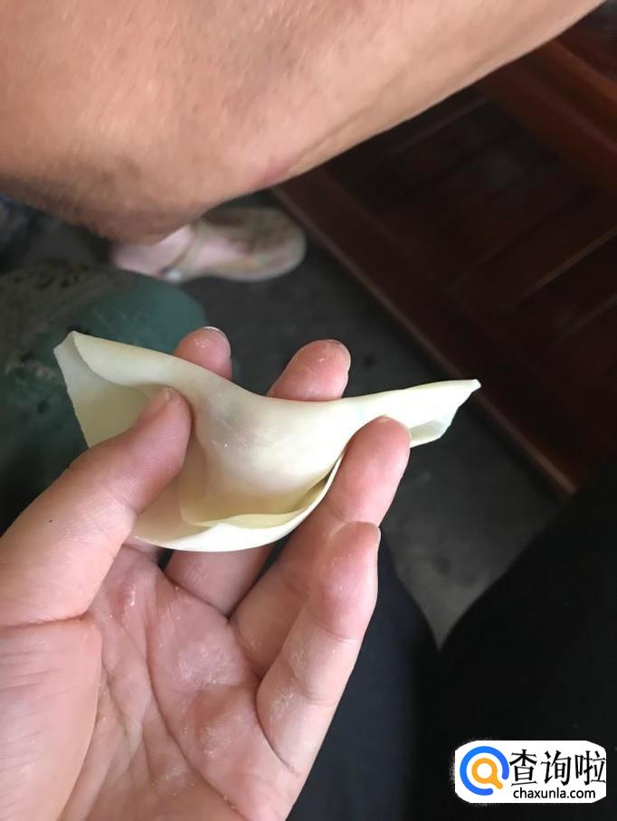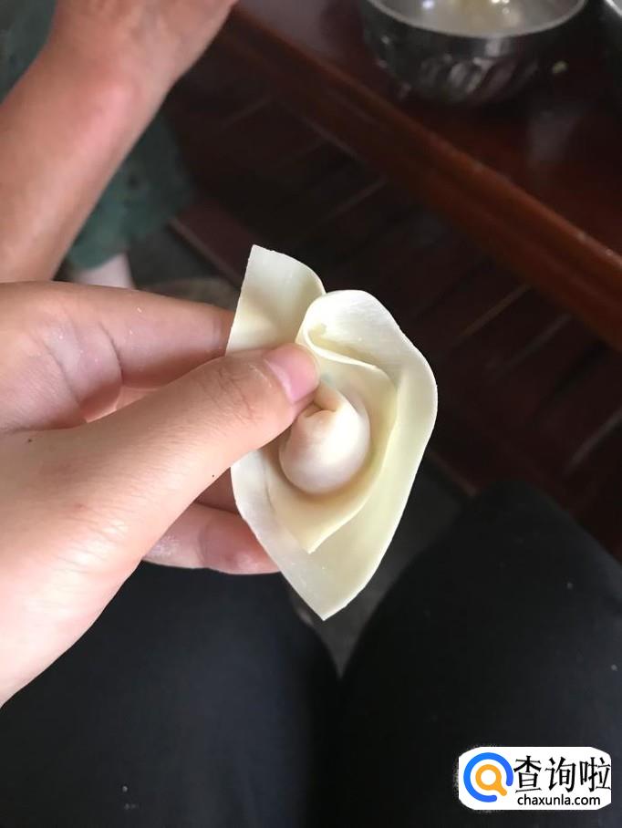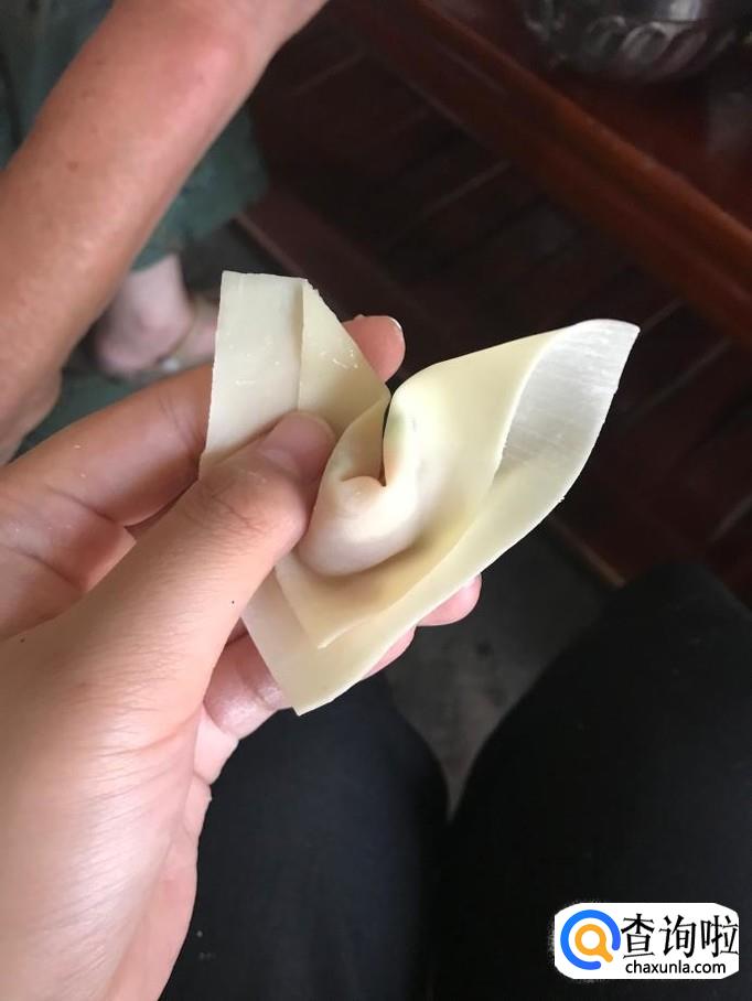 此时该半成品呈一三角形状,在三角形左边的这个角上蘸取少量事先准备好的清水以便后面抄手易于成形而不会散开。