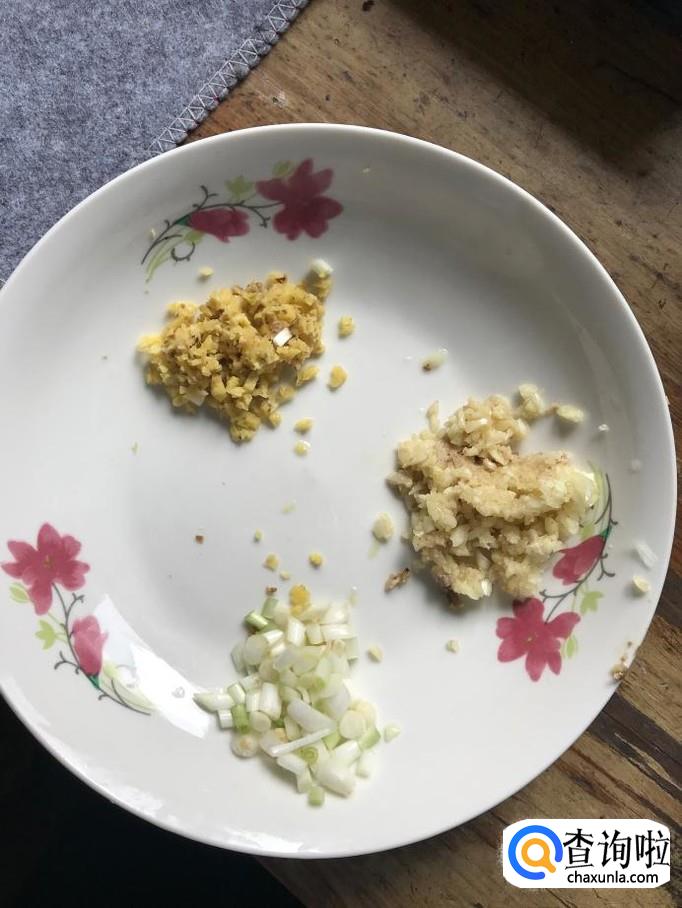 准备生姜一块,蒜两至三瓣,将姜和蒜切成末备用,切取小葱的葱白部分成段备用,这几样调味料可以有效去除肉的腥味。