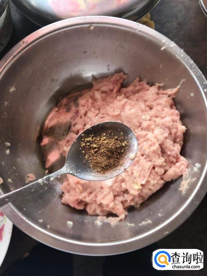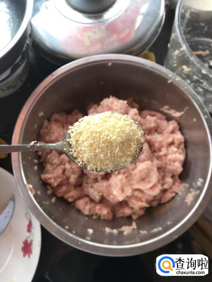取一小勺干淀粉溶于适量水,待淀粉沉淀后,倒掉淀粉上层的水,将剩余的淀粉倒入肉馅中。加入上诉调味料后对肉馅进行充分搅拌。最后加入一把香葱,再次进行搅拌,可以有效提高肉馅的香味。
