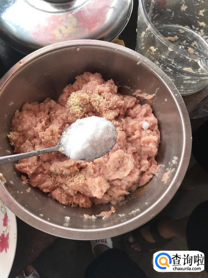 取一个干净的碗,把碎肉放入其中,依次加入姜末,蒜末,葱段。再加入盐适量,鸡精一小勺,花椒面小半勺,一颗鸡蛋的蛋清。还可以依据个人的口味加入适量胡椒粉。