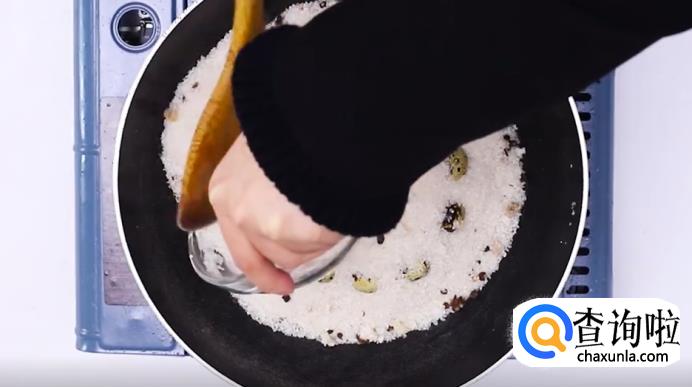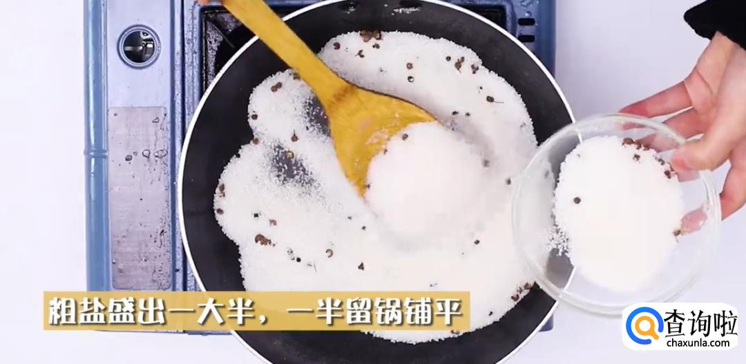 然后将炒好的粗盐盛出一大半来,剩下的一半留在锅内,用勺子铺平。