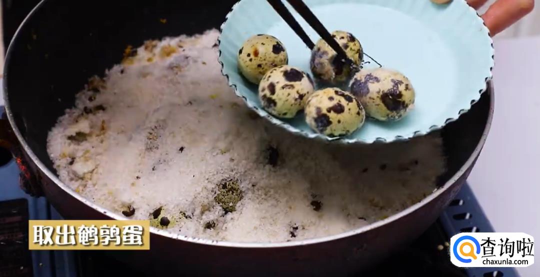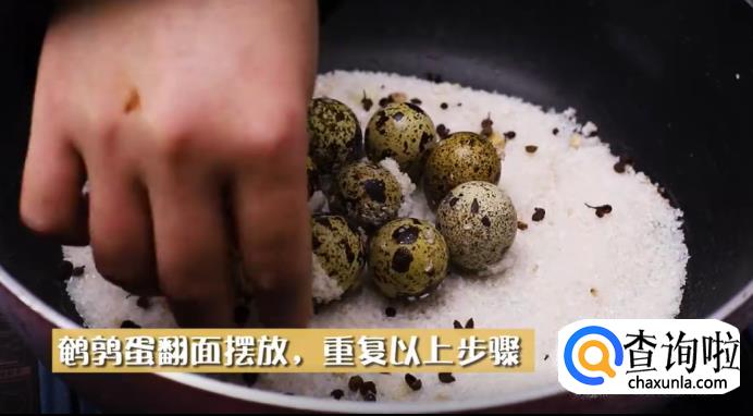 到时间后,把鹌鹑蛋取出来,再重复刚才的步骤,盛出一大半粗盐,把鹌鹑蛋翻一个面摆进去,再倒入粗盐。