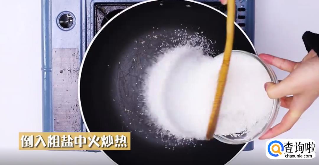 将准备好的粗盐倒进锅里,开火炒热。