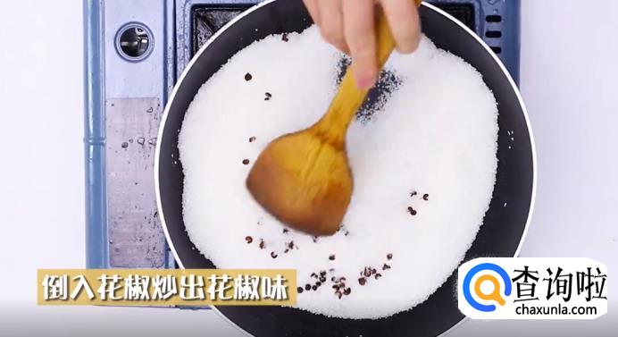 接着,把花椒倒进去,一起翻炒,直至炒出花椒味来。