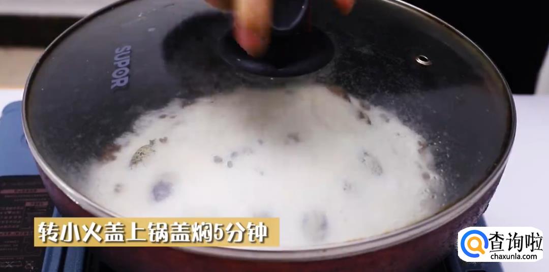 接下来,开到小火,盖上锅盖,焖5分钟左右。