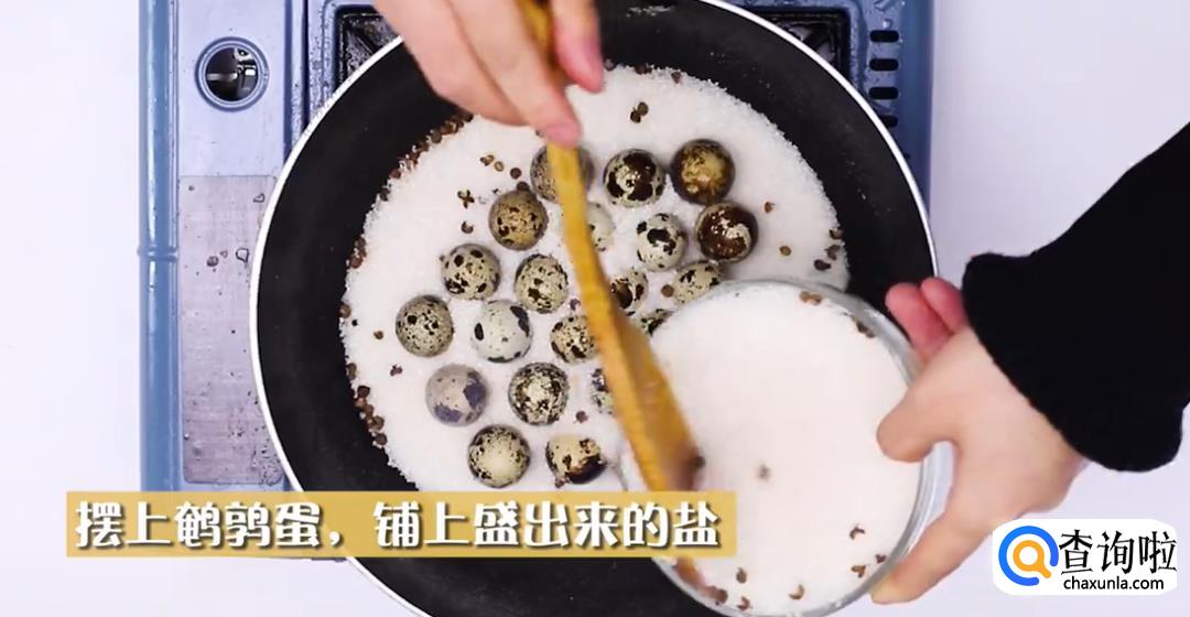 把准备好的鹌鹑蛋摆在装有粗盐的锅里,然后将刚才盛出的粗盐倒进去,铺在鹌鹑蛋上。