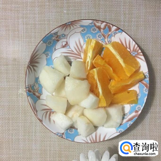 然后将梨去皮切成小块,橙子去皮切成小块。