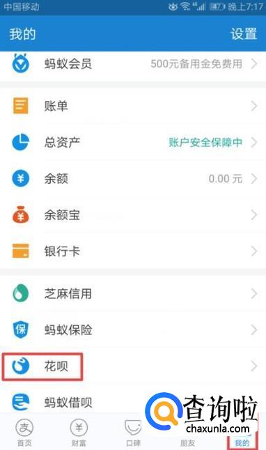 进入支付宝之后,我们点击我的,然后点击花呗;