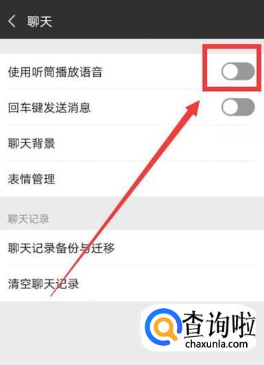 进入之后,将图示位置的“使用听筒播放声音”的开关关闭掉即可解决这个问题,如图所示。