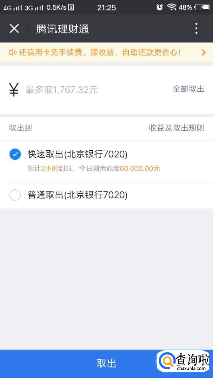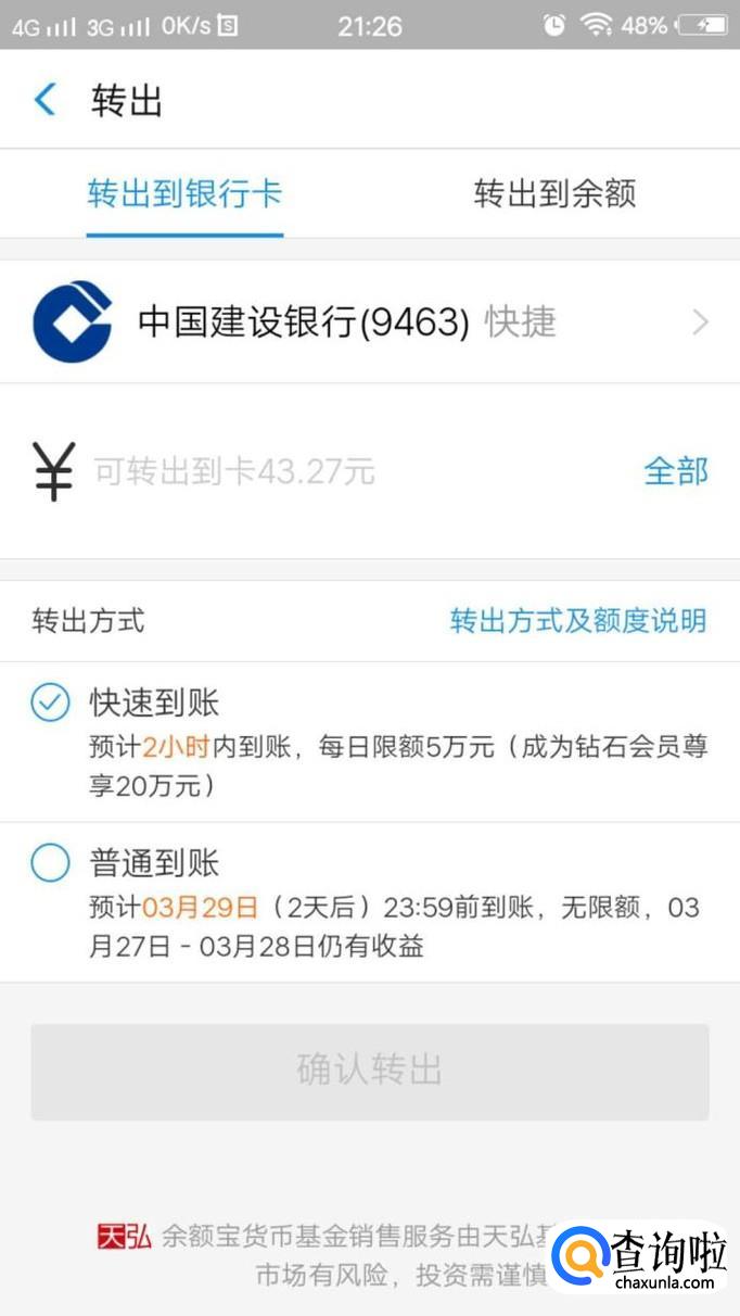 余额宝提取款项两小时内到账提款限额为5万,而理财通提取款项两小时内到账提款限额为6万。